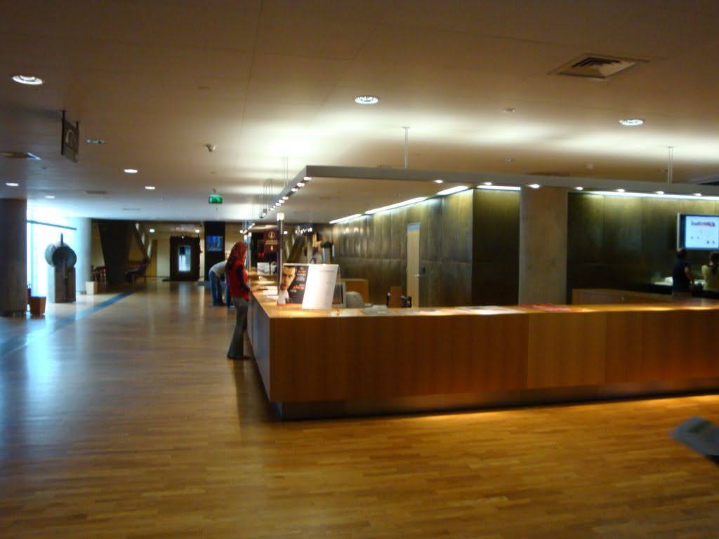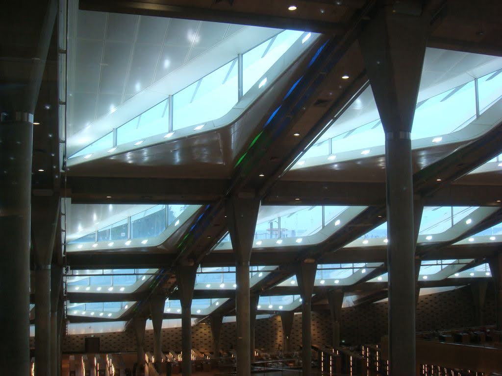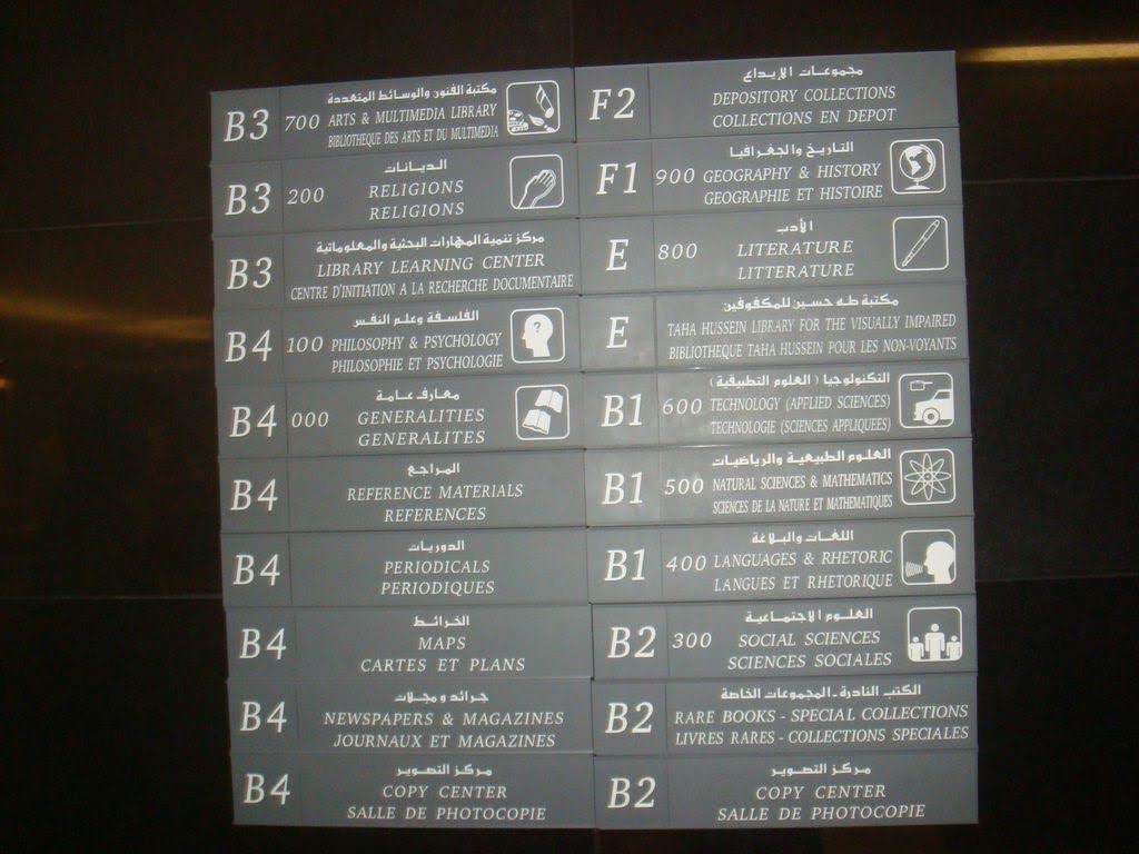 ทางเข้าชั้น 1 มีเครื่องตรวจสิ่งของที่นำเข้ามาในห้องสมุด เคาน์เตอร์ฝากของ ร้านจำหน่ายของที่ระลึก ผ่านเข้ามาชั้นในมีเครื่องกันขโมย เคาน์เตอร์บริการยืมคืน ขึ้นไปอีกขั้นหนึ่งจะเป็นระเบียง ที่ให้ชื่อเป็นเกียรติแก่ Callimachus ผู้เป็นบิดาทางบรรณารักษศาสตร์ ผู้ริเริ่มการจัดหมวดหมู่โดยหัวเรื่องและผู้แต่ง ระเบียงแห่งนี้สามารถมองเห็นโถงที่นั่งอ่านได้โดยรอบทุกชั้น เพราะสร้างเป็นชั้นลดหลั่นกันไป มีเสารองรับหลังคาที่ลาดเทลดหลั่นกันไป จำนวน 7 ชั้น เป็นที่นั่งอ่านหนังสือทั่วไป และหนังสืออ้างอิง หลังคาทำด้วยกระจกโปร่งแสง ตามชั้นหนังสือ และเสาเพดานจะติดหลอดไฟให้แสงสว่างในเวลากลางคืน