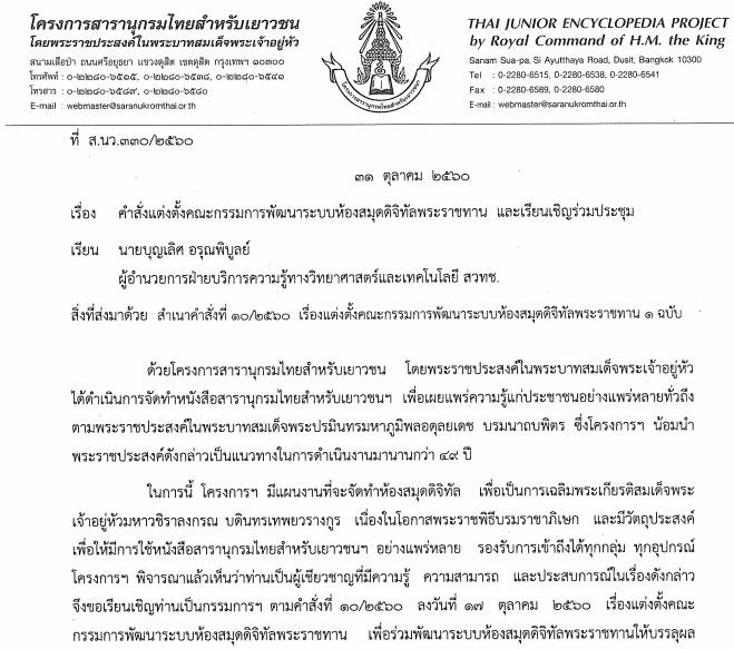 31 October 201717 August 2021 boonlertaroonpiboon คณะกรรมการพัฒนาระบบห้องสมุดดิจิทัลพระราชทานโครงการสารานุกรมไทยสำหรับเยาวชน ได้รับการแต่งตั้งให้ร่วมเป็นคณะกรรมการพัฒนาระบบห้องสมุดดิจิทัลพระราชทานโครงการสารานุกรมไทยสำหรับเยาวชน Share this:Share Email a link to a friend (Opens in new window) Email Print (Opens in new window) Print Share on Facebook (Opens in new window) Facebook Like Loading... ที่เกี่ยวข้อง