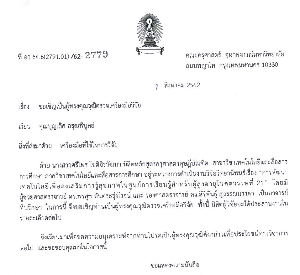 ได้รับเชิญให้เป็นผู้ทรงคุณวุฒิตรวจเครื่องมือวิจัยสำหรับวิทยานิพนธ์ การพัฒนารูปแบบเทคโนโลยีเพื่อส่งเสริมการรู้สุขภาพในศูนย์การเรียนรู้สำหรับผู้สูงอายุในศตวรรษที่ 21 ของนางสาวศรีไพร โชติจิรวัฒนา นิสิตปริญญาเอก สาขาวิชาเทคโนโลยีและสื่อสารการศึกษา คณะครุศาสตร์ จุฬาลงกรณ์มหาวิทยาลัย