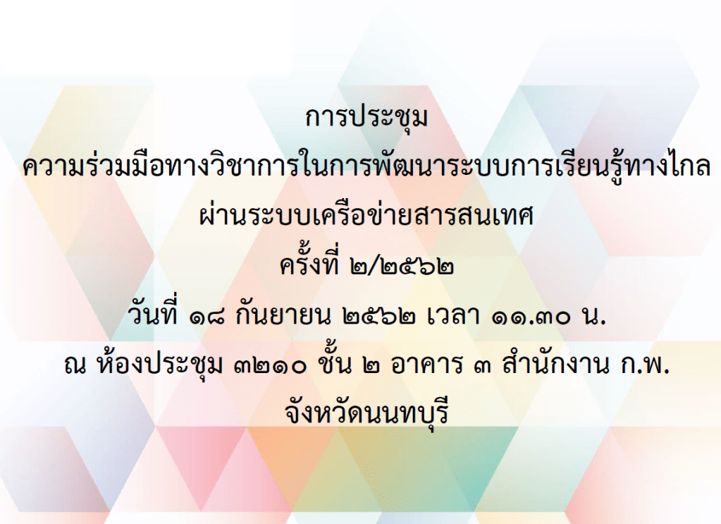 18 September 20194 November 2025 boonlertaroonpiboon ประชุมความร่วมมือทางวิชาการในการพัฒนาระบบการเรียนรู้ทางไกลผ่านระบบเครือข่ายสารสนเทศ Share this:Share Email a link to a friend (Opens in new window) Email Print (Opens in new window) Print Share on Facebook (Opens in new window) Facebook Like Loading... ที่เกี่ยวข้อง