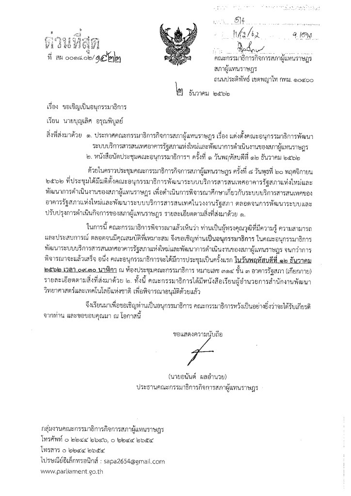ได้รับการแต่งตั้งจากคณะกรรมการธิการกิจการสภาผู้แทนราษฎร ให้ร่วมเป็นคณะอนุกรรมาธิการพัฒนาระบบบริการสารสนเทศอาคารรัฐสภาแห่งใหม่และพัฒนาการดำเนินงานของสภาผู้แทนราษฎร