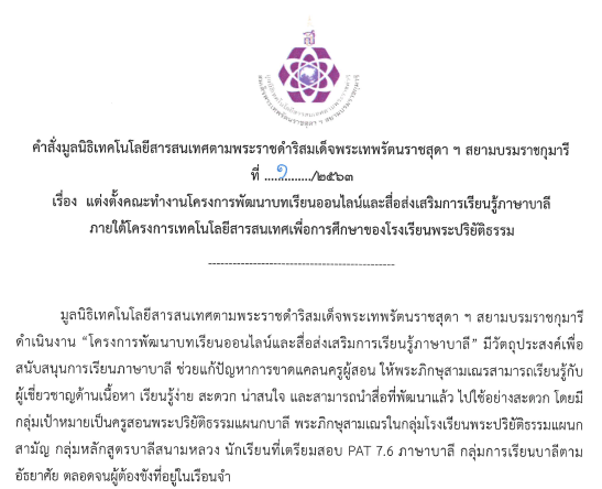 คณะทำงานด้านเทคนิค การออกแบบระบบการเรียนออนไลน์ และการพัฒนาสื่อส่งเสริมการเรียนรู้ภาษาบาลี ภายใต้โครงการเทคโนโลยีสารสนเทศเพื่อการศึกษาของโรงเรียนพระปริยัติธรรม เอกสารคำสั่ง