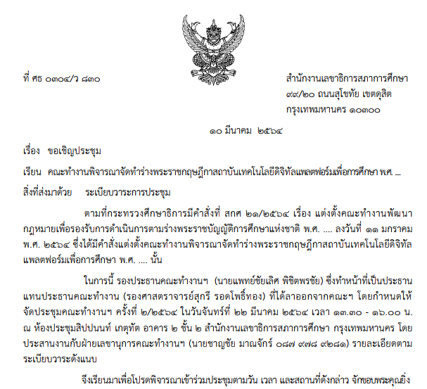 สำนักงานเลขาธิการสภาการศึกษา เรียนเชิญ นายบุญเลิศ อรุณพิบูลย์ ประชุมคณะทำงานพิจารณาจัดทำร่างพระราชกฤษฎีกาสถาบันเทคโนโลยีดิจิทัลแพลตฟอร์มเพื่อการศึกษา พ.ศ. …. ในวันจันทร์ที่ 22 มีนาคม 2564 เวลา 13.30 – 16.00 น. ณ ห้องประชุมสิปปนนท์ เกตุทัต อาคาร 2 ชั้น 2 สำนักงานเลขาธิการสภาการศึกษา กรุงเทพมหานคร