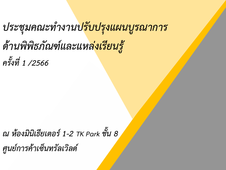 7 April 20232 March 2025 boonlertaroonpiboon ประชุมคณะทำงานปรับปรุงแผนบูรณาการด้านพิพิธภัณฑ์และแหล่งเรียนรู้ครั้งที่ 1/2566 Share this:Share Email a link to a friend (Opens in new window) Email Print (Opens in new window) Print Share on Facebook (Opens in new window) Facebook Like Loading... ที่เกี่ยวข้อง