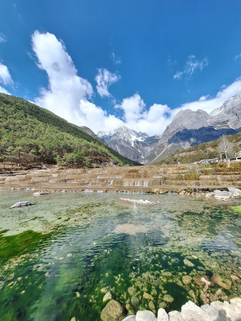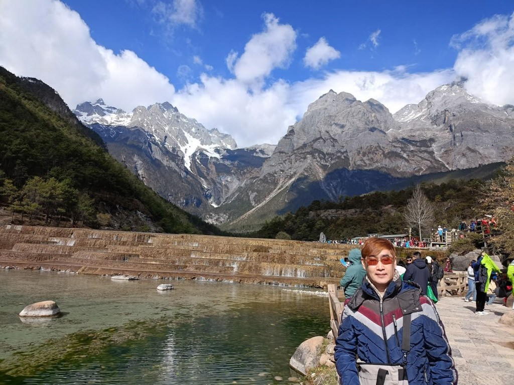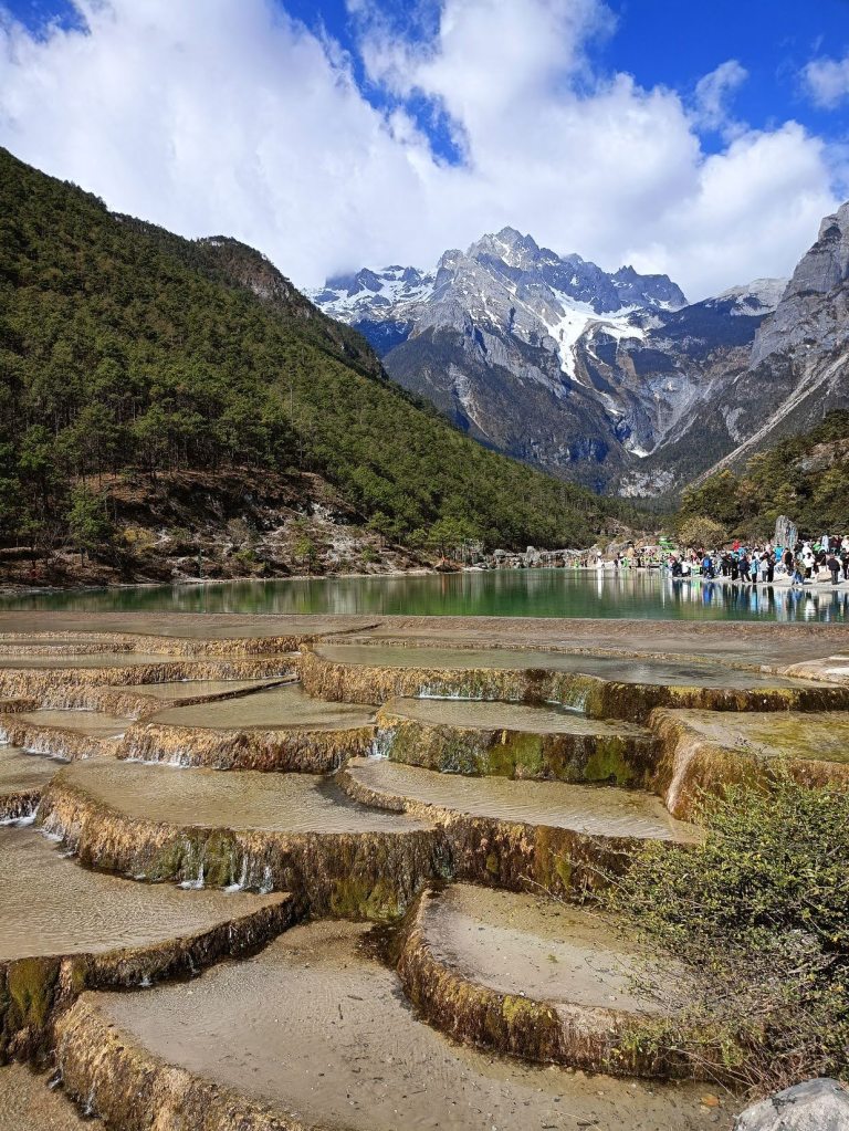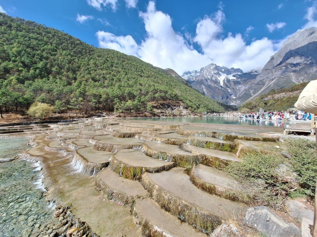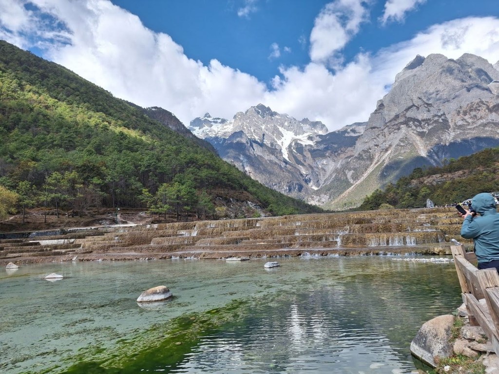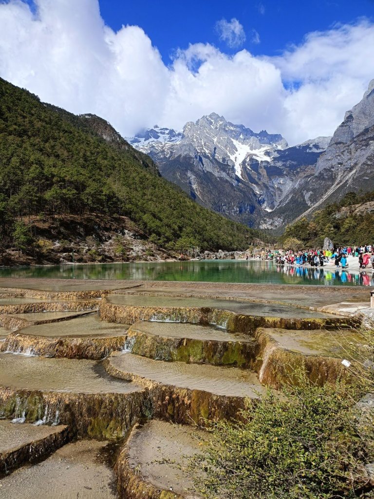 หุบเขาพระจันทร์สีน้ำเงิน ไป๋สุ่ยเห่อ .. อีกหนึ่งไฮไลต์ของทริปคุนหมิง .. อยู่ในพื้นที่เดียวกับภูเขาหิมะมังกรหยก … หลังจากขึ้นไปบนยอดเขา ก็จะลงมาที่หุบเขาแห่งนี้ ซึ่งได้วิวภูเขาพร้อมแอ่งน้ำที่ซ้อนๆกัน น้ำใสมาก สีฟ้าเขียว แบลคกราวด์เป็นภูเขาหิมะมังกรหยก สวยงามมาก