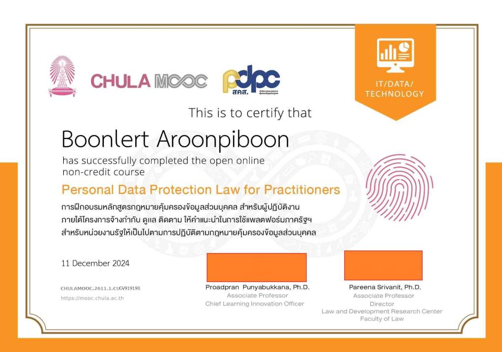 ประกาศนียบัตรรับรองการเข้าอบรมหลักสูตรกฎหมายคุ้มครองข้อมูลส่วนบุคคล สำหรับผู้ปฏิบัติงาน ภายใต้โครงการจ้างกำกับ ดูแล ติดตาม ให้คำแนะนำในการใช้แพลตฟอร์มภาครัฐฯ สำหรับหน่วยงานภาครัฐให้เป็นไปตามการปฏิบัติตามกฎหมายคุ้มครองข้อมูลส่วนบุคคล