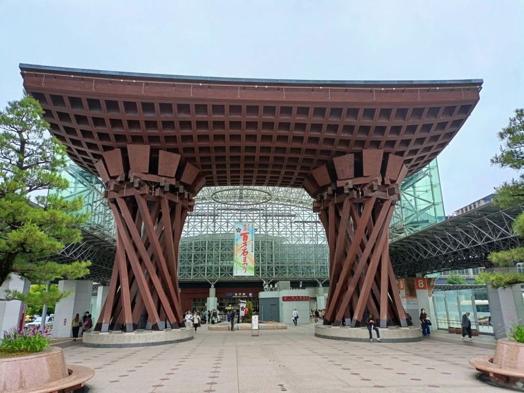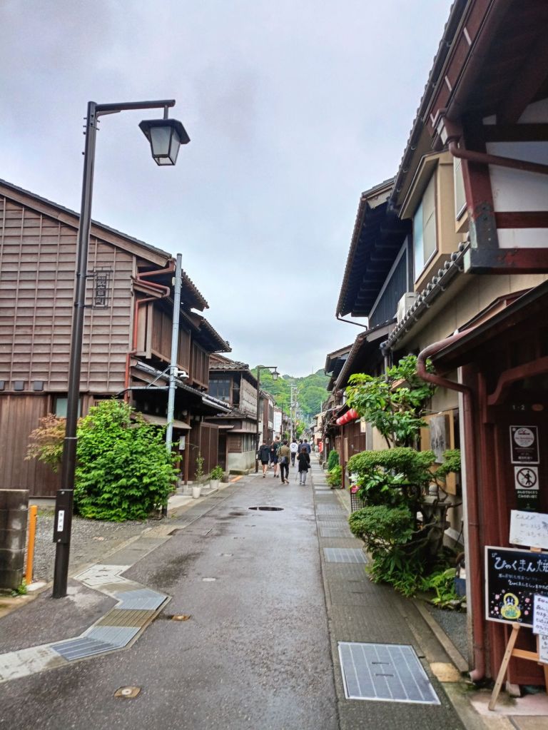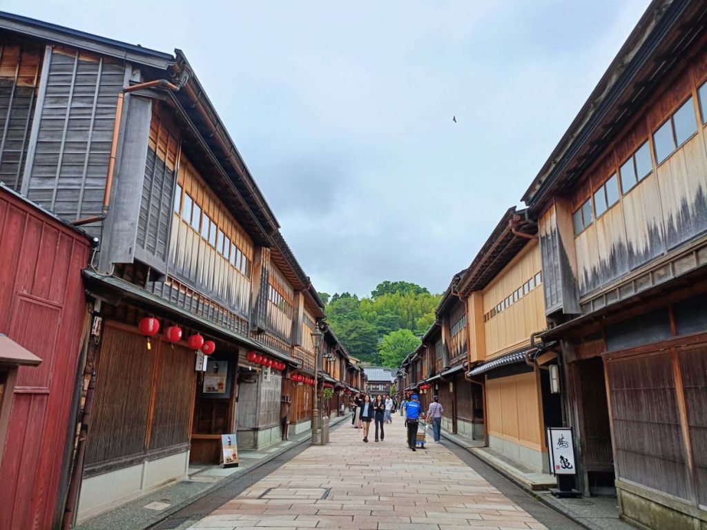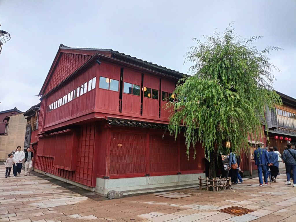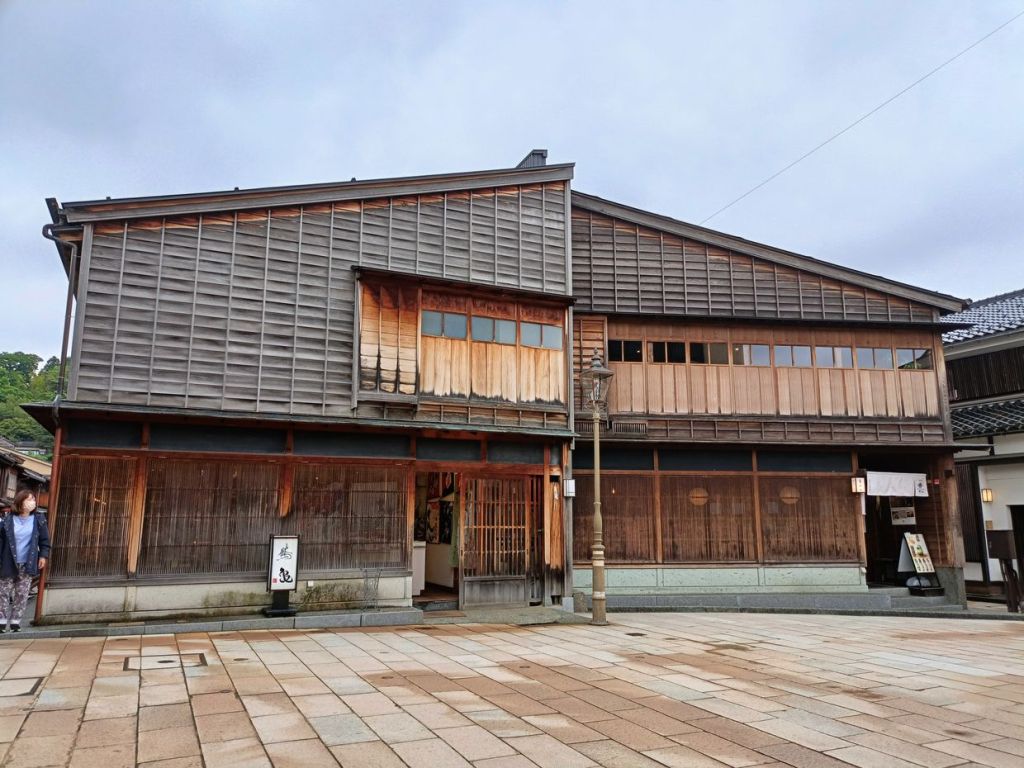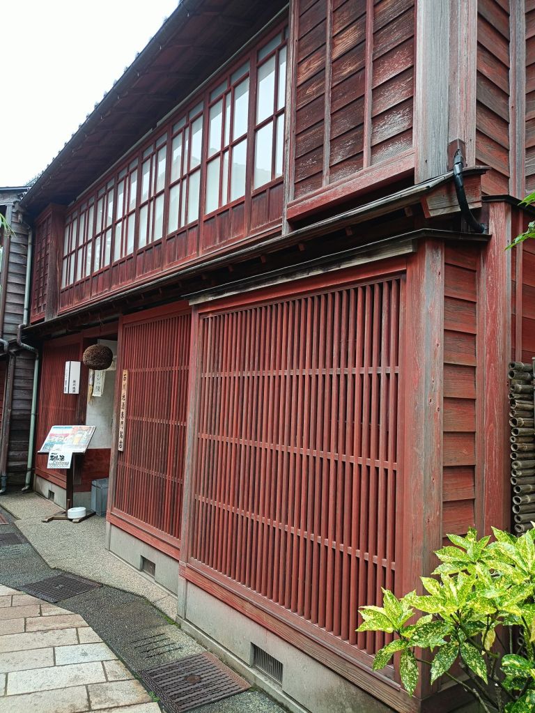 สถานี Kanazawa มีจุดเช็คอินที่น่าสนใจคือ ประตูสึซึมิ-มง (Tsuzumi-mon Gate) ประตูไม้ขนาดใหญ่ที่จำลองมาจากกลองของละครโน และ โมเตนาชิโดม (Motenashi Dome) โครงสร้างกระจกรูปทรงร่มที่สง่างาม ได้รับการยอมรับว่าเป็นหนึ่งในสถานีรถไฟที่สวย มีจุดขึ้นรถบัสหลายจุด เป้าหมายเราคือ Higashi Chaya District เป็นย่านเก่าแก่ของเมือง มีมาตั้งแต่สมัยเอโดะหลากหลายด้วยโรงน้ำชาที่มี Geisha มาให้ความบันเทิงกับแขกที่มาใช้บริการในโรงน้ำชา ไม่ว่าจะเป็นการแสดงดนตรี เต้นรำ เล่นเกมต่างๆ ที่ให้แขกร่วมเล่นด้วย โดยปัจจุบันมีการอนุรักษ์อาคารต่างๆ ในย่านนี้ไว้ดังเดิม จุดเด่นก็คงเป็นอาคารไม้ ผนังทาสีแดง พื้นยังใช้เสื่อทาทามิ รวมถึงการจัดแสดงอุปกรณ์เครื่องใช้สมัยก่อนให้ผู้สนใจได้ศึกษา