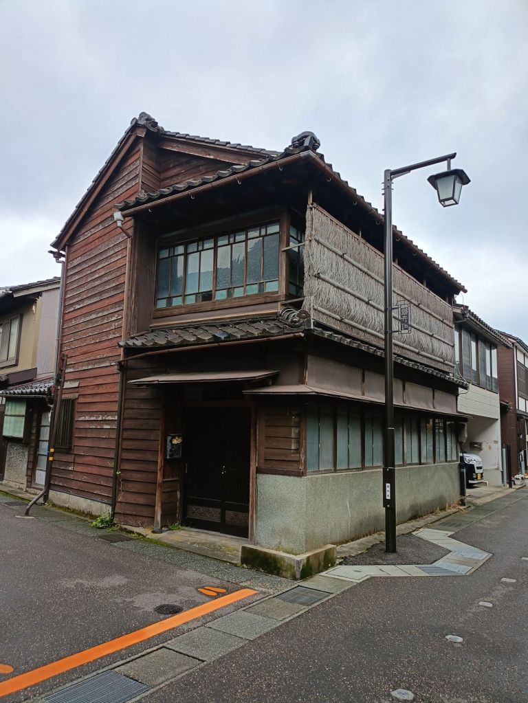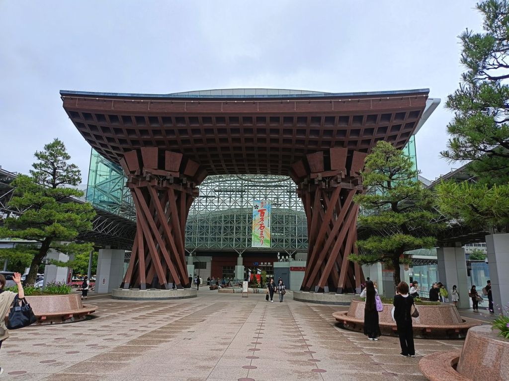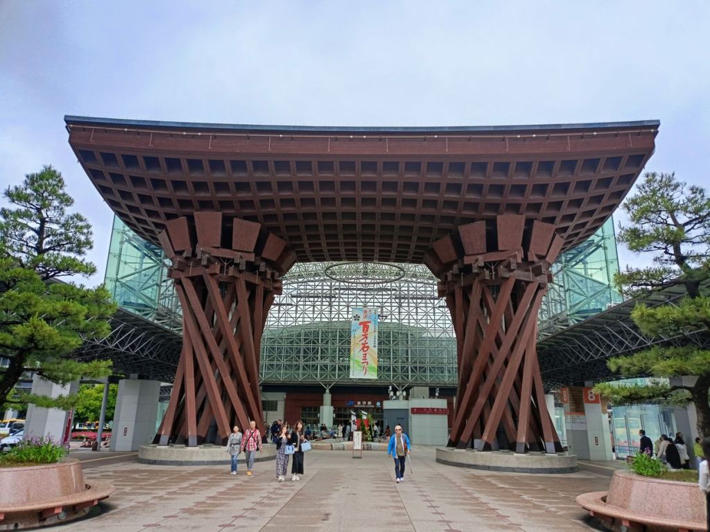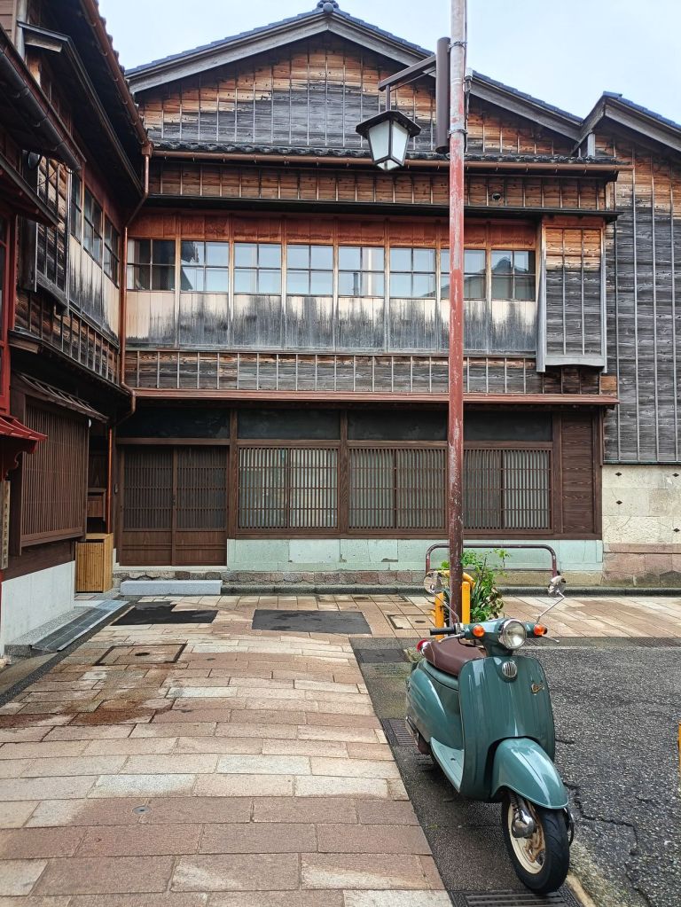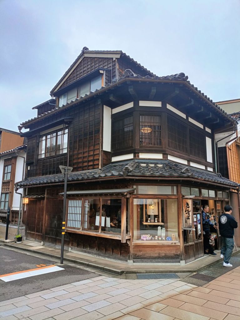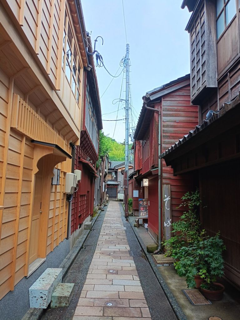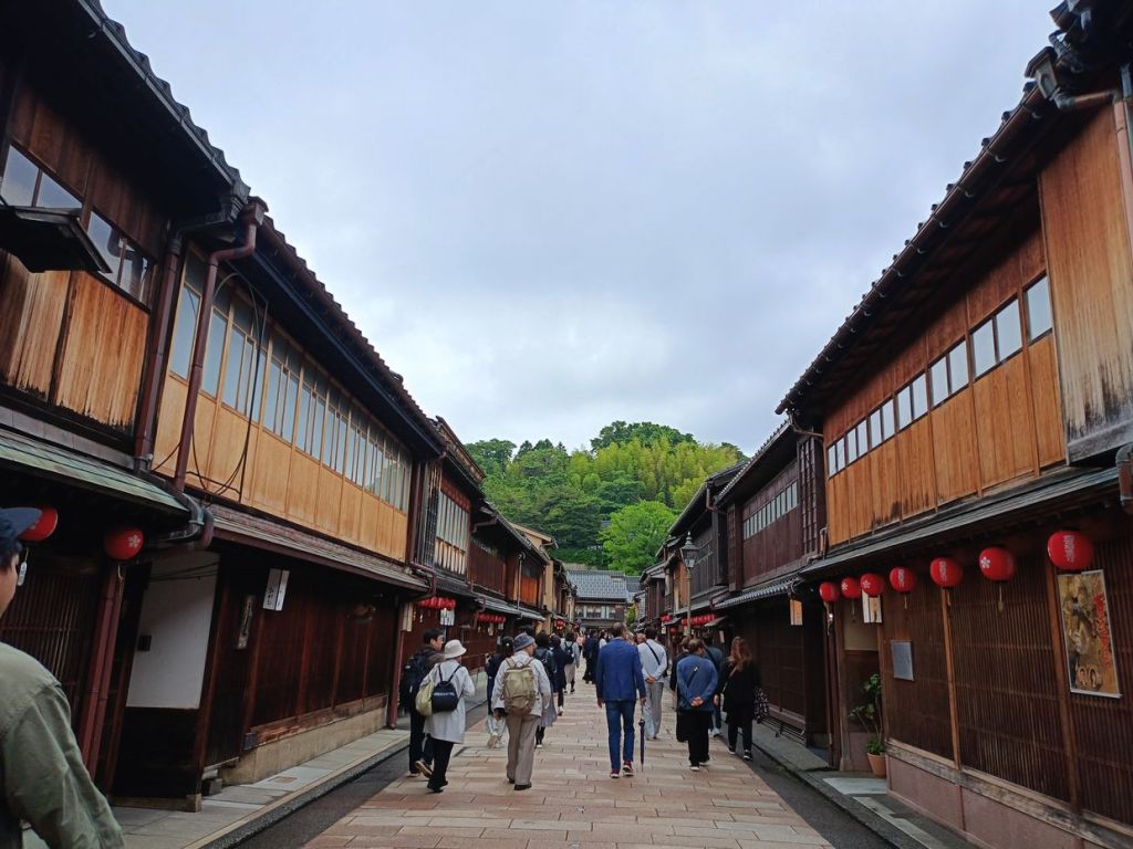 สถานี Kanazawa มีจุดเช็คอินที่น่าสนใจคือ ประตูสึซึมิ-มง (Tsuzumi-mon Gate) ประตูไม้ขนาดใหญ่ที่จำลองมาจากกลองของละครโน และ โมเตนาชิโดม (Motenashi Dome) โครงสร้างกระจกรูปทรงร่มที่สง่างาม ได้รับการยอมรับว่าเป็นหนึ่งในสถานีรถไฟที่สวย มีจุดขึ้นรถบัสหลายจุด เป้าหมายเราคือ Higashi Chaya District เป็นย่านเก่าแก่ของเมือง มีมาตั้งแต่สมัยเอโดะหลากหลายด้วยโรงน้ำชาที่มี Geisha มาให้ความบันเทิงกับแขกที่มาใช้บริการในโรงน้ำชา ไม่ว่าจะเป็นการแสดงดนตรี เต้นรำ เล่นเกมต่างๆ ที่ให้แขกร่วมเล่นด้วย โดยปัจจุบันมีการอนุรักษ์อาคารต่างๆ ในย่านนี้ไว้ดังเดิม จุดเด่นก็คงเป็นอาคารไม้ ผนังทาสีแดง พื้นยังใช้เสื่อทาทามิ รวมถึงการจัดแสดงอุปกรณ์เครื่องใช้สมัยก่อนให้ผู้สนใจได้ศึกษา