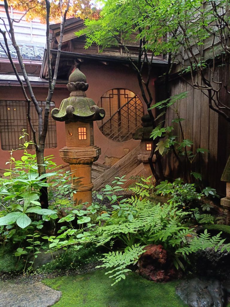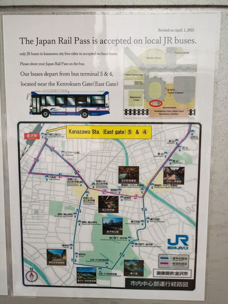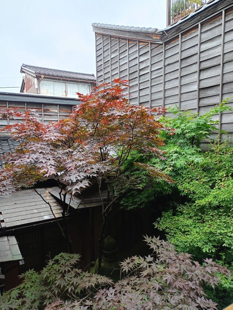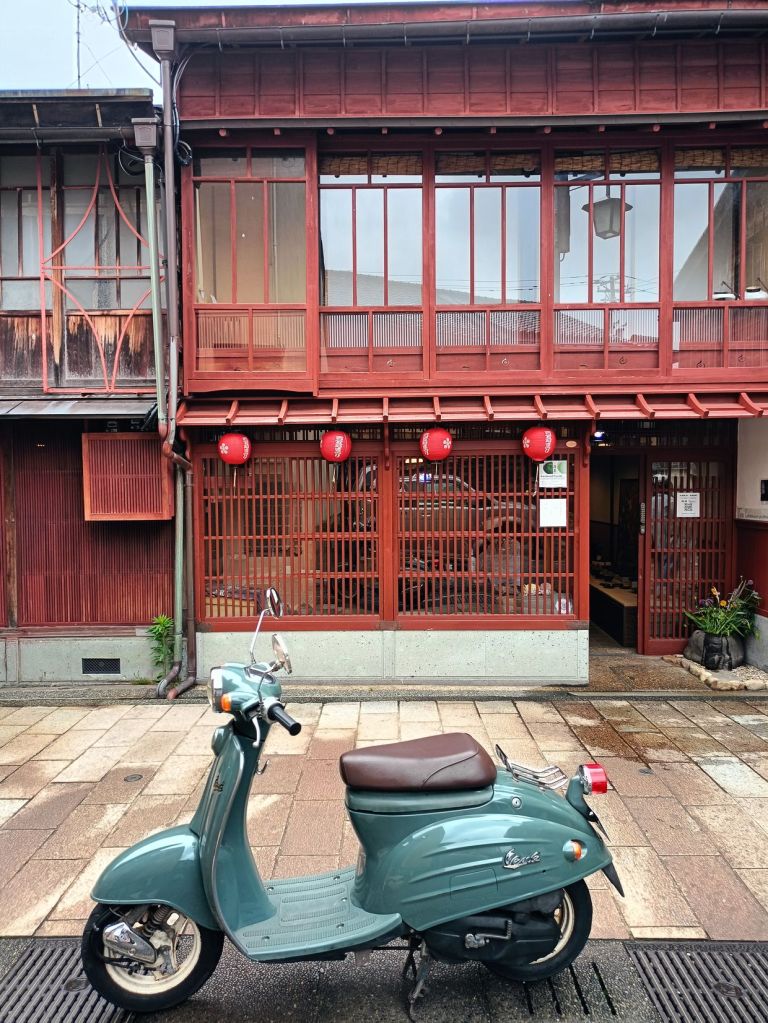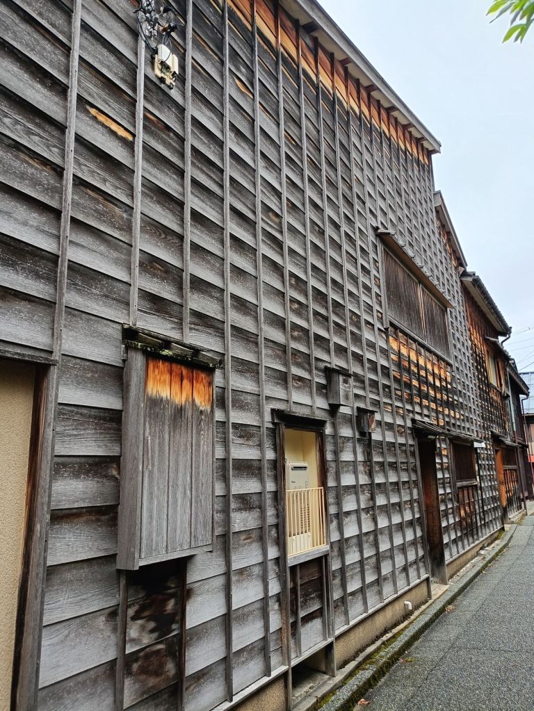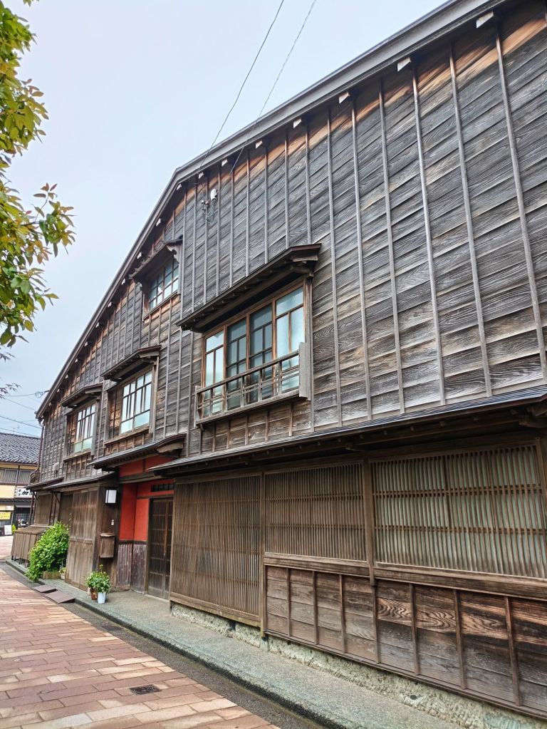 สถานี Kanazawa มีจุดเช็คอินที่น่าสนใจคือ ประตูสึซึมิ-มง (Tsuzumi-mon Gate) ประตูไม้ขนาดใหญ่ที่จำลองมาจากกลองของละครโน และ โมเตนาชิโดม (Motenashi Dome) โครงสร้างกระจกรูปทรงร่มที่สง่างาม ได้รับการยอมรับว่าเป็นหนึ่งในสถานีรถไฟที่สวย มีจุดขึ้นรถบัสหลายจุด เป้าหมายเราคือ Higashi Chaya District เป็นย่านเก่าแก่ของเมือง มีมาตั้งแต่สมัยเอโดะหลากหลายด้วยโรงน้ำชาที่มี Geisha มาให้ความบันเทิงกับแขกที่มาใช้บริการในโรงน้ำชา ไม่ว่าจะเป็นการแสดงดนตรี เต้นรำ เล่นเกมต่างๆ ที่ให้แขกร่วมเล่นด้วย โดยปัจจุบันมีการอนุรักษ์อาคารต่างๆ ในย่านนี้ไว้ดังเดิม จุดเด่นก็คงเป็นอาคารไม้ ผนังทาสีแดง พื้นยังใช้เสื่อทาทามิ รวมถึงการจัดแสดงอุปกรณ์เครื่องใช้สมัยก่อนให้ผู้สนใจได้ศึกษา