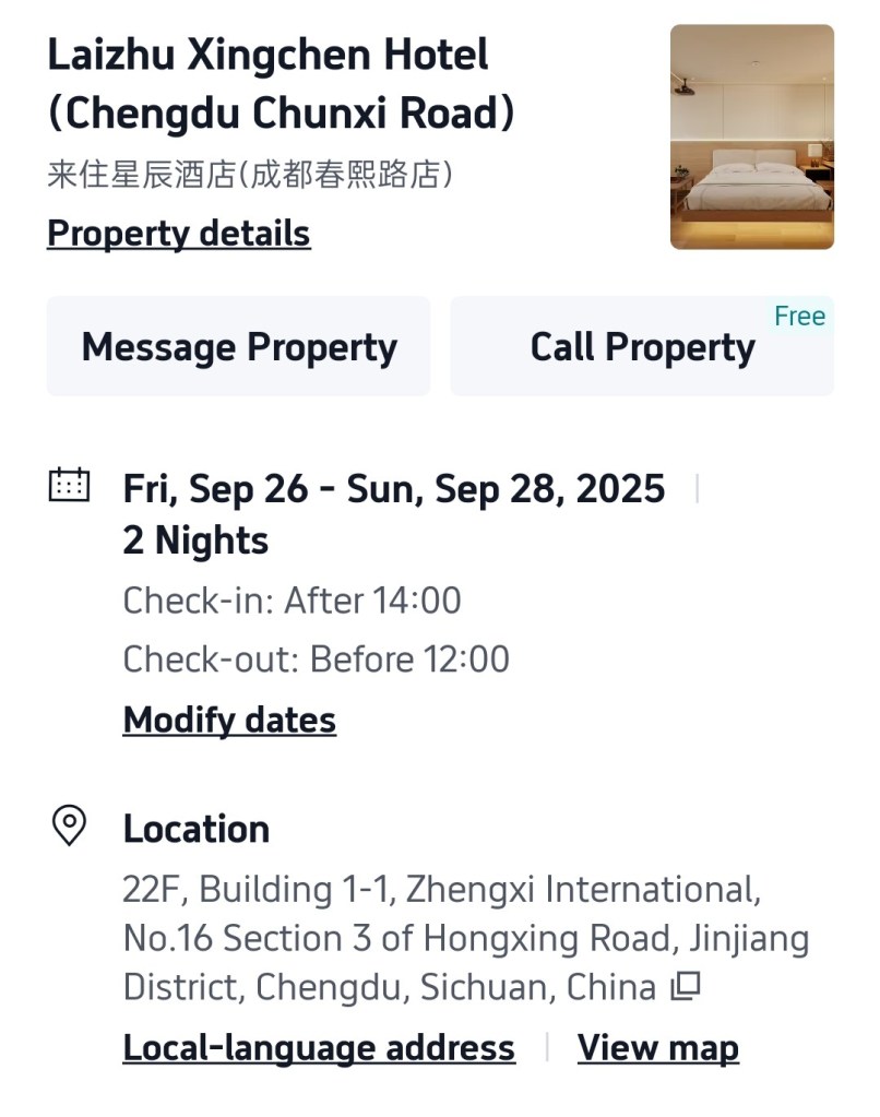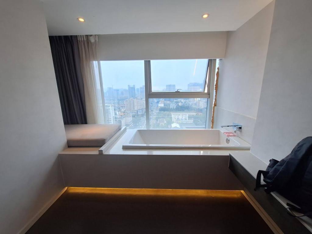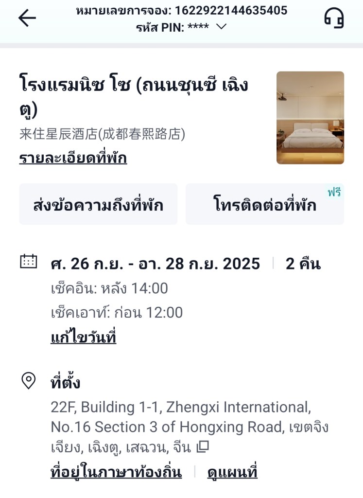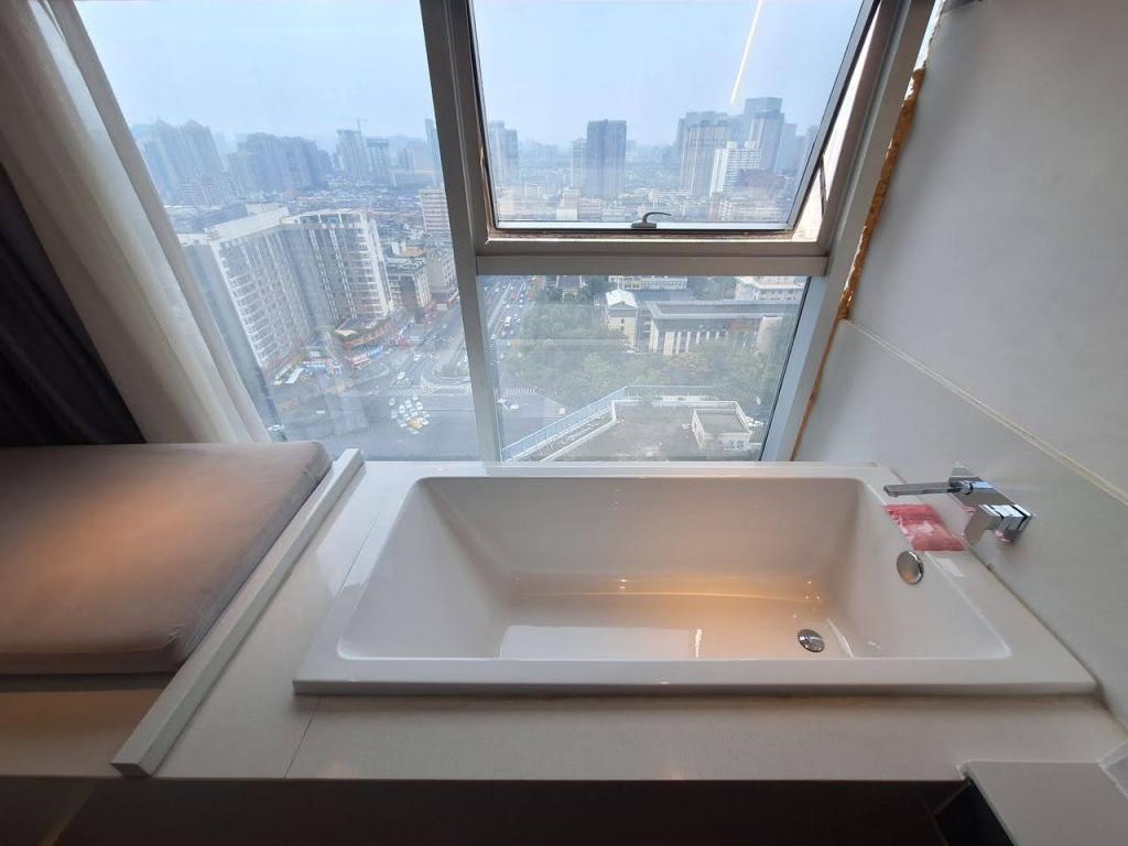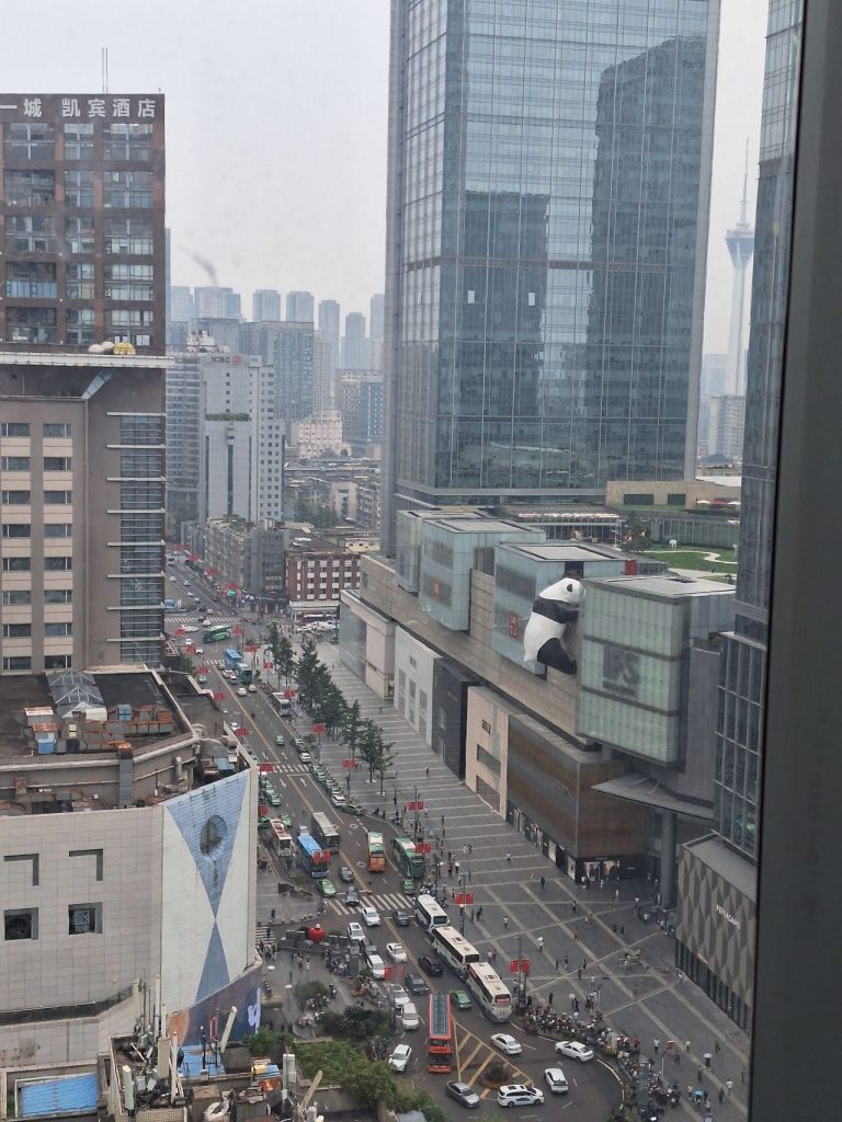 จากสนามบินเฉิงตูเทียนฟู เรานั่งรถบัสตรงมาโรงแรม Laizhu Xingchen Hotel (Chengdu Chunxi Road) โดยนั่งยาวมาถึงป้ายสุดท้ายเลยครับ ฝั่งตรงข้ามคือตึก IFS ที่มี Panda ปีนตึกโดดเด่นมาก เมื่อลงป้ายรถ ก็เดินทางมาถึงแยกจะเลี้ยวขวา หรือเดินตรงไปอีกนิด ก็จะเจอทางเลี้ยวเข้าโรงแรม … สังเกตยากสักนิดครับ เข้าไปในตึกก็กดลิฟท์ไปชั้น 22 … เราถึงโรงแรมประมาณ 10 โมง โชคดีที่แจ้งตอนจองว่าขอเช็คอินก่อนเวลา … โรงแรมก็จัดการให้เช็คอินเข้าห้องพักได้เลย … ห้องพักกว้าง ฟังก์ชันครบถ้วนมาก มีอ่างแช่ริมกระจกมองบรรยากาศถนน Chunxi .. มีเครื่องดื่มให้ 2 ขวดต่อวัน และน้ำดื่มอีก 2 ขวด แต่วันที่ 2 เราได้ 4 ขวด …. ชอบๆๆๆๆ โรงแรมนี้ถ้าแสดงด้วยชื่อภาษาไทย จะพบว่าชื่อไม่ตรงกับชื่อภาษาอังกฤษ แต่จริงๆ คือโรงแรมเดียวกัน