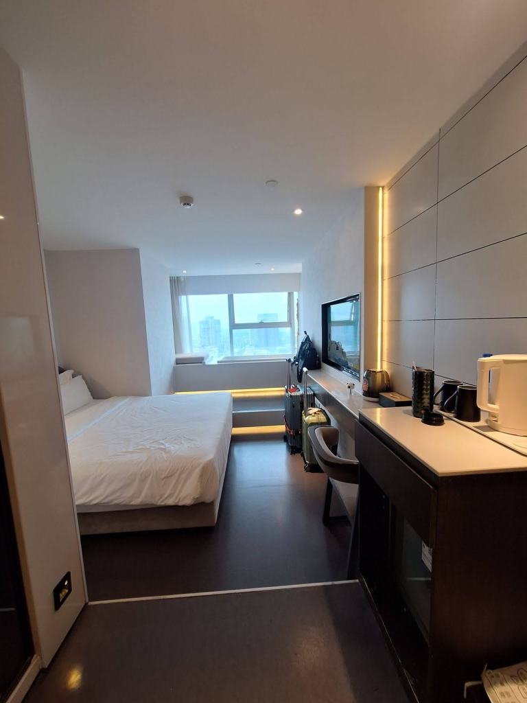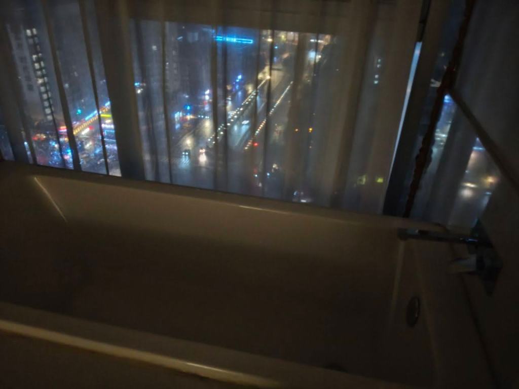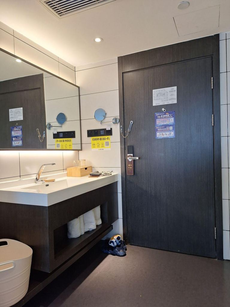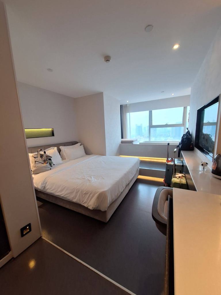 จากสนามบินเฉิงตูเทียนฟู เรานั่งรถบัสตรงมาโรงแรม Laizhu Xingchen Hotel (Chengdu Chunxi Road) โดยนั่งยาวมาถึงป้ายสุดท้ายเลยครับ ฝั่งตรงข้ามคือตึก IFS ที่มี Panda ปีนตึกโดดเด่นมาก เมื่อลงป้ายรถ ก็เดินทางมาถึงแยกจะเลี้ยวขวา หรือเดินตรงไปอีกนิด ก็จะเจอทางเลี้ยวเข้าโรงแรม … สังเกตยากสักนิดครับ เข้าไปในตึกก็กดลิฟท์ไปชั้น 22 … เราถึงโรงแรมประมาณ 10 โมง โชคดีที่แจ้งตอนจองว่าขอเช็คอินก่อนเวลา … โรงแรมก็จัดการให้เช็คอินเข้าห้องพักได้เลย … ห้องพักกว้าง ฟังก์ชันครบถ้วนมาก มีอ่างแช่ริมกระจกมองบรรยากาศถนน Chunxi .. มีเครื่องดื่มให้ 2 ขวดต่อวัน และน้ำดื่มอีก 2 ขวด แต่วันที่ 2 เราได้ 4 ขวด …. ชอบๆๆๆๆ โรงแรมนี้ถ้าแสดงด้วยชื่อภาษาไทย จะพบว่าชื่อไม่ตรงกับชื่อภาษาอังกฤษ แต่จริงๆ คือโรงแรมเดียวกัน