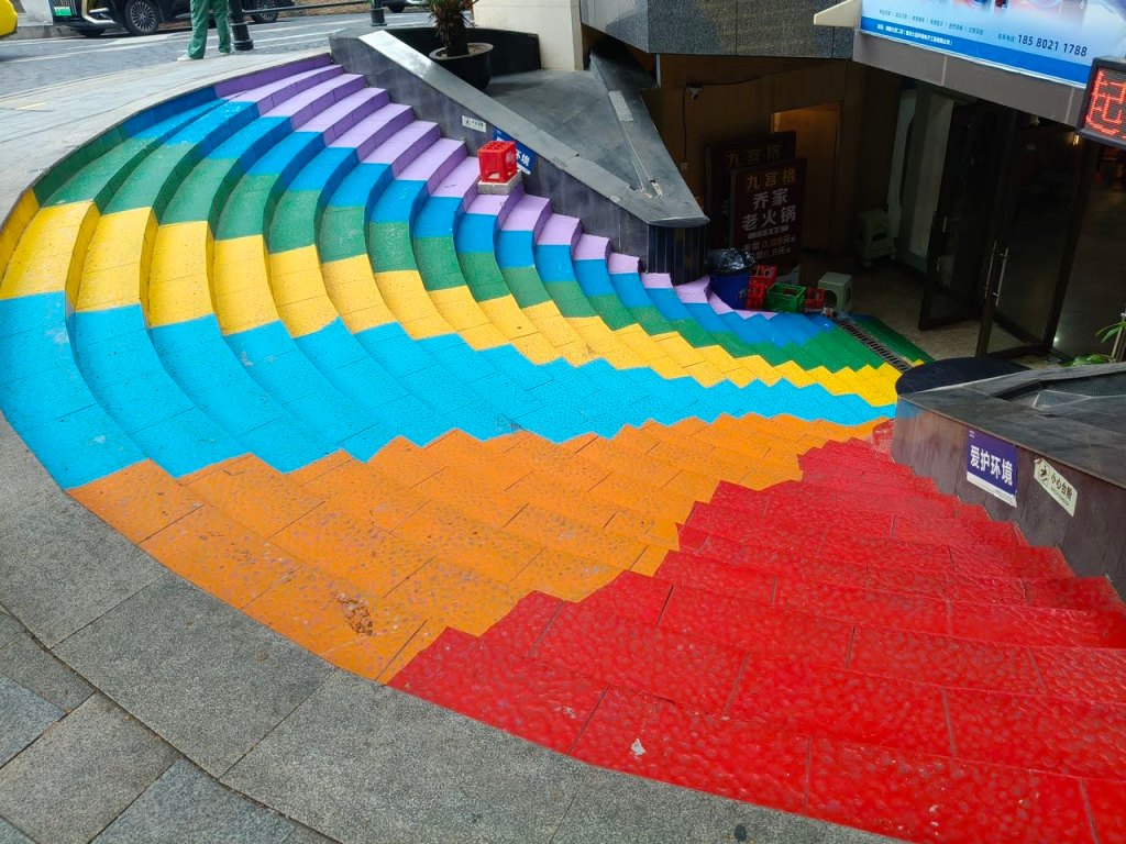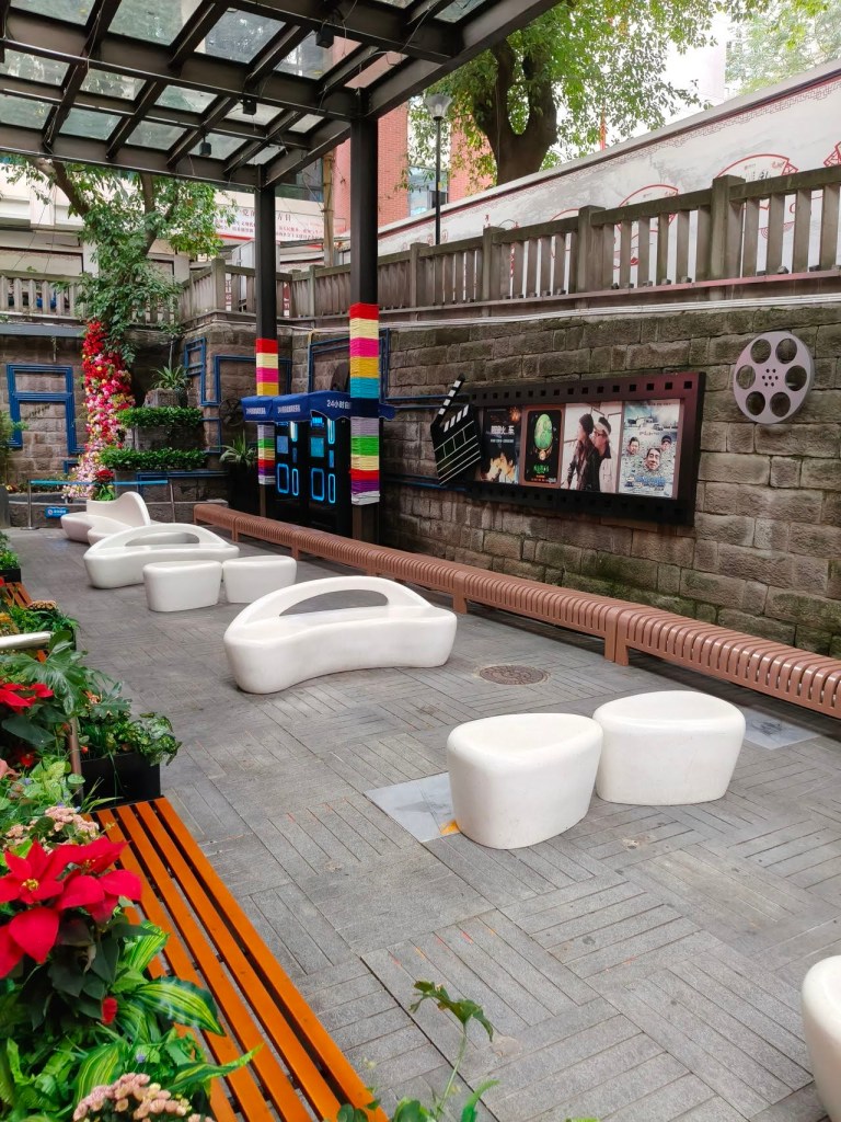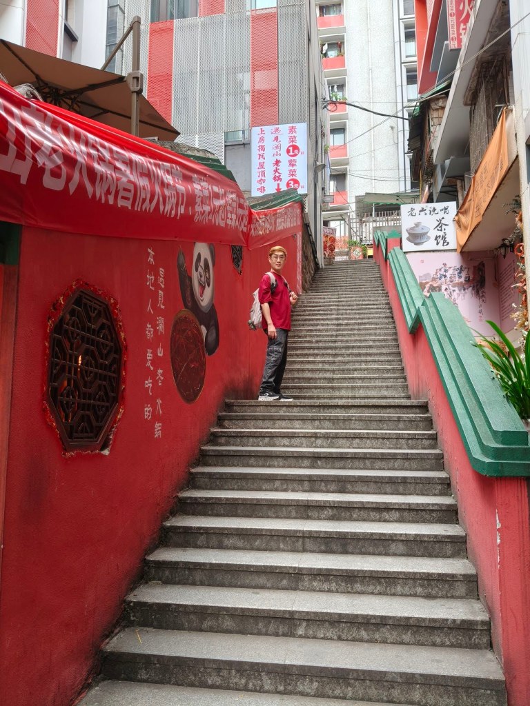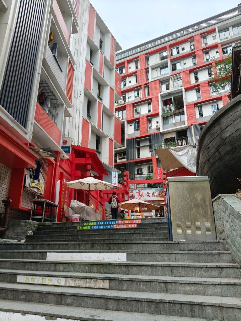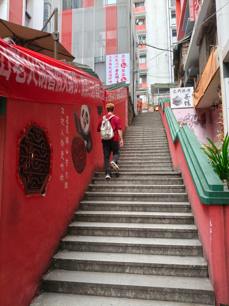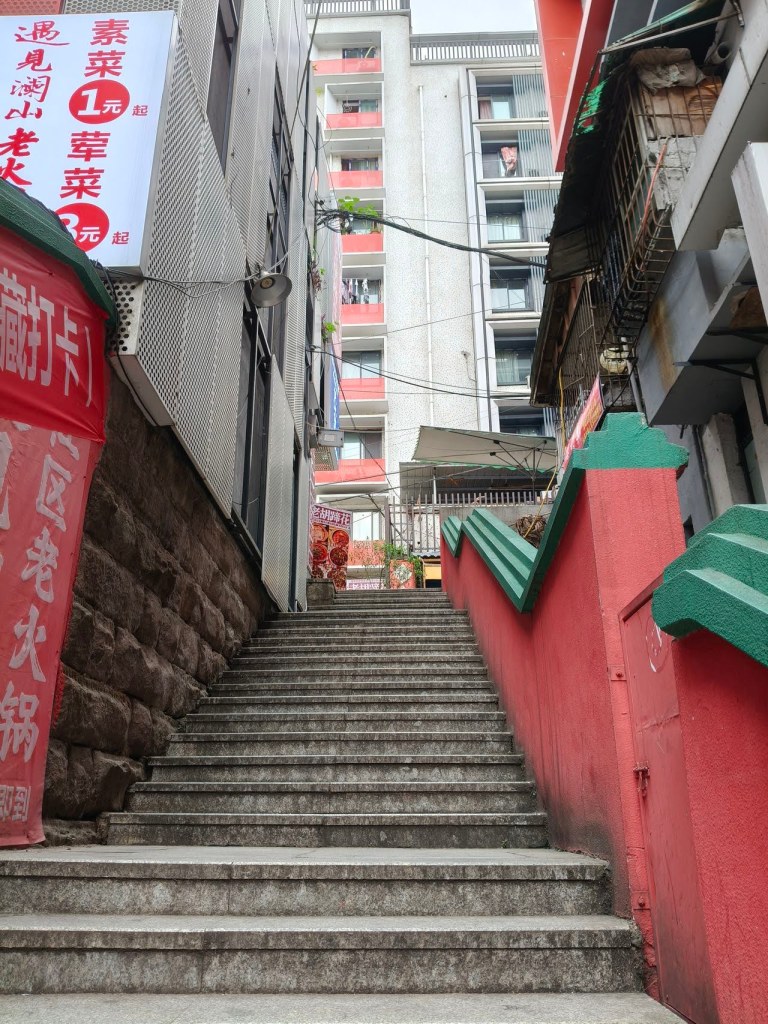 จากสถานีกระเช้าลอยฟ้าถนนซ่างซิน ก็เดินออกมาที่ถนนใหญ่ ข้ามไปฝั่งตรงข้าม จะเจอหมู่อาคารสีแดงที่มีบันไดแบบขึ้นเนินที่สวยงาม ก็เดินเรื่อยๆ เก็บภาพครับ