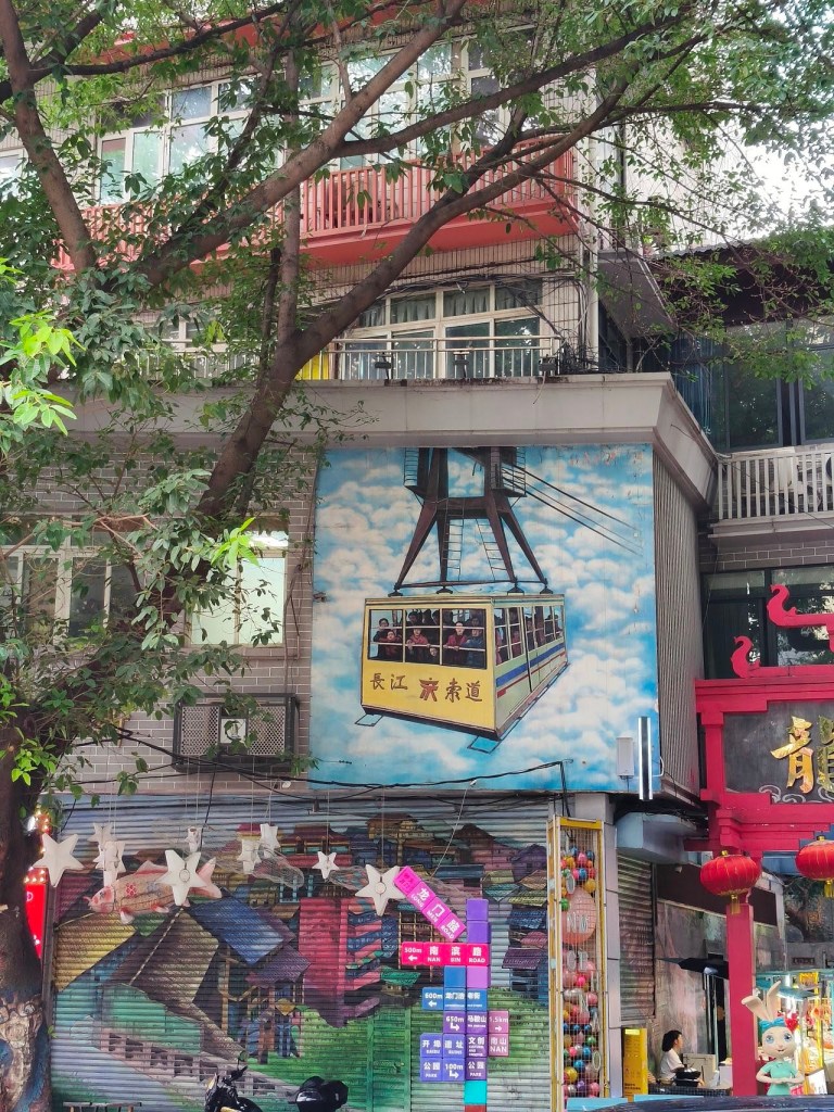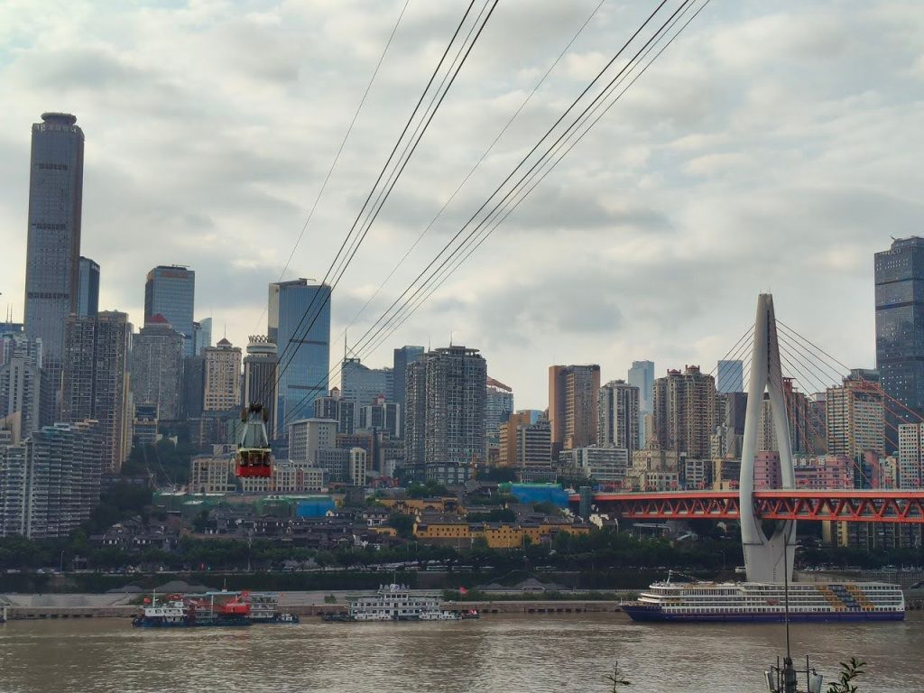 อิ่มท้องก็เดินเก็บภาพรอบๆ โรงแรม และไปสถานีกระเช้าเคเบิลแม่น้ำแยงซี Yangtze River Cableway ในฉงชิ่งเป็นสัญลักษณ์ของเมืองที่ต้องไปสักครั้งเพื่อชมวิวเมืองแบบ 360 องศา จากโรงแรมที่พักแถว Jiefangbei ก็เดินมาเรื่อยๆ ตามแผนที่จนถึงสถานีกระเช้าลอยฟ้าถนนซินหัว ก็จัดไปสัก 1 รอบ ปลายทางคือสถานีกระเช้าลอยฟ้าถนนซ่างซิน Shangxin Street Cableway Station ที่สถานีนี้ เราแวะหาเครื่องดื่มเย็นๆ รสชาติดีทานพร้อมเก็บภาพบรรยากาศ