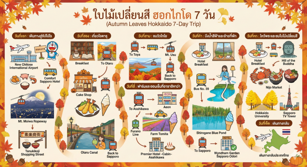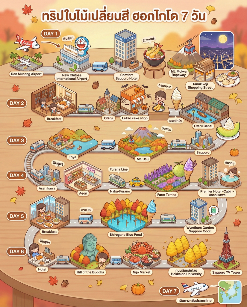 สร้าง infographic ธีมใบไม้เปลี่ยนสี สไตล์ Cute Chibi Isometric 3D สไตล์มินิมอล รายละเอียดพอดี ไม่รก จัดเลย์เอาต์เป็น ไทม์ไลน์แนวตั้งจากบนลงล่าง (DAY 1 –> DAY 7) สัดส่วนภาพ 4:5