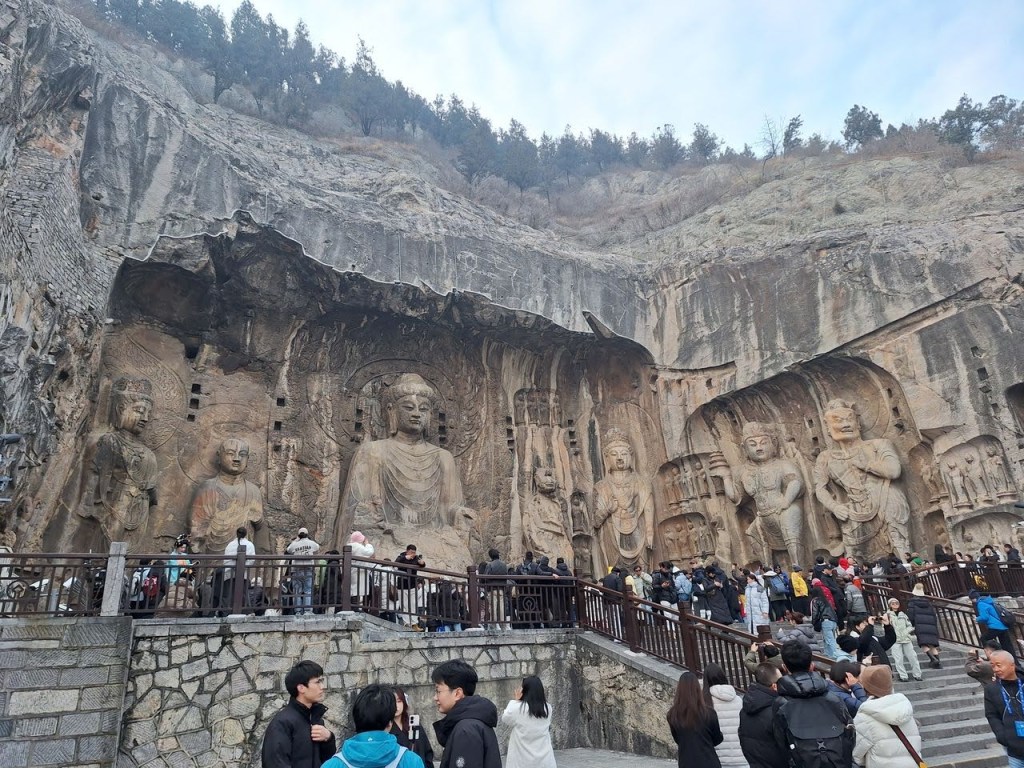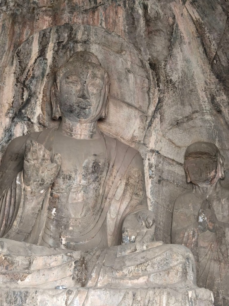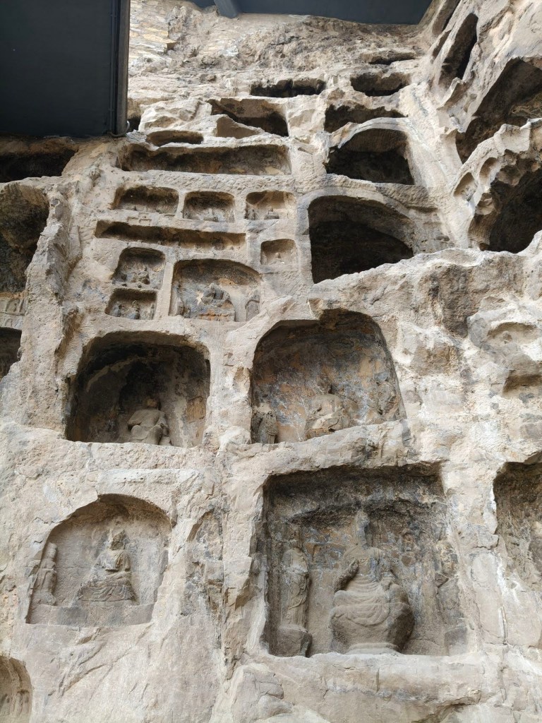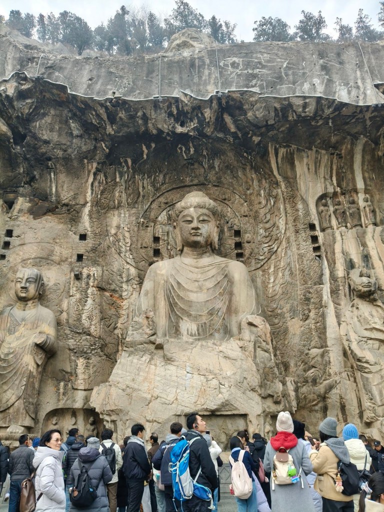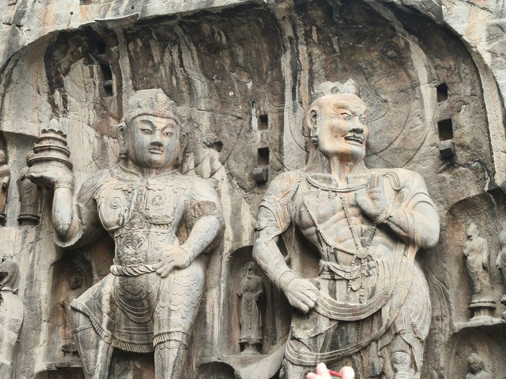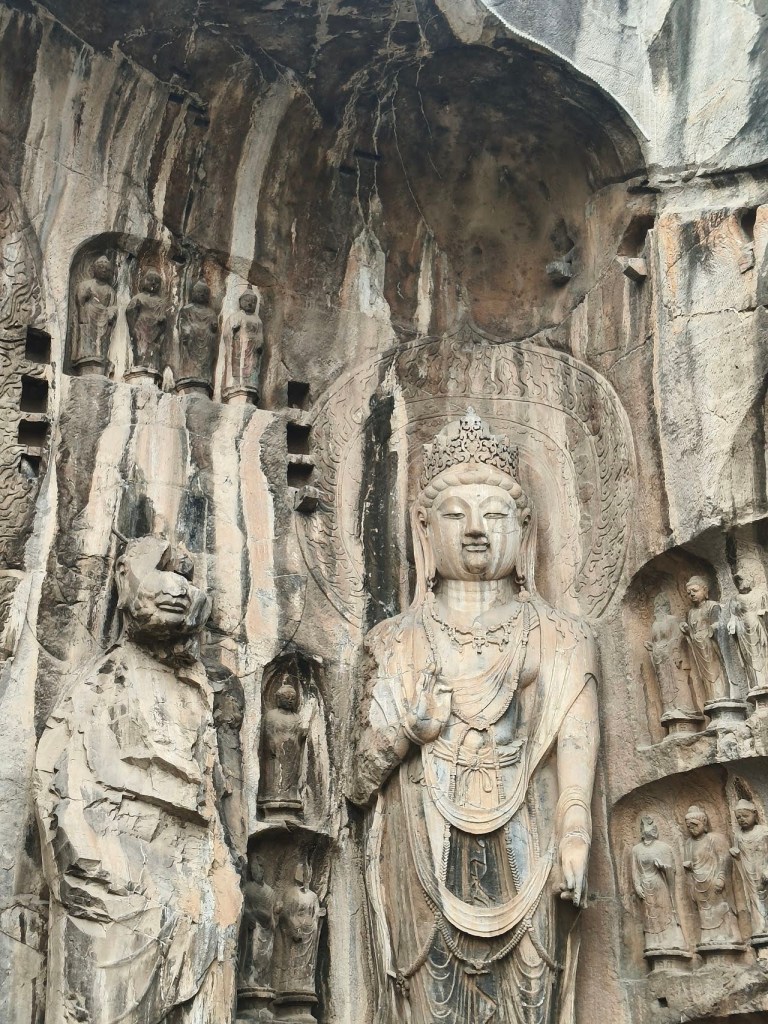 ที่นี่เราจะได้พบกับความยิ่งใหญ่อลังของงานแกะสลักหน้าผาขนาบแม่น้ำอี๋ (Yi River) อายุกว่า 1,500 ปี จนได้รับยกย่องจาก UNESCO ให้เป็นมรดกโลก เช่น พระโพธิสัตว์ไวโรจนะ (Vairocana Buddha) องค์ใหญ่ยักษ์สูงกว่า 17 เมตร ใบหน้าอิ่มเอิบ สง่างามมาก ขนาบข้างด้วยรูปปั้นพระสาวกและทวารบาลที่แกะสลักได้ดูมีกล้ามเนื้อและอารมณ์ที่สมจริงสุดๆ