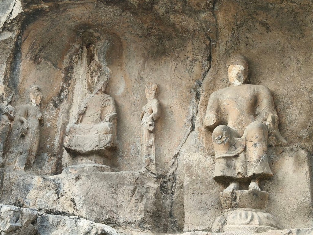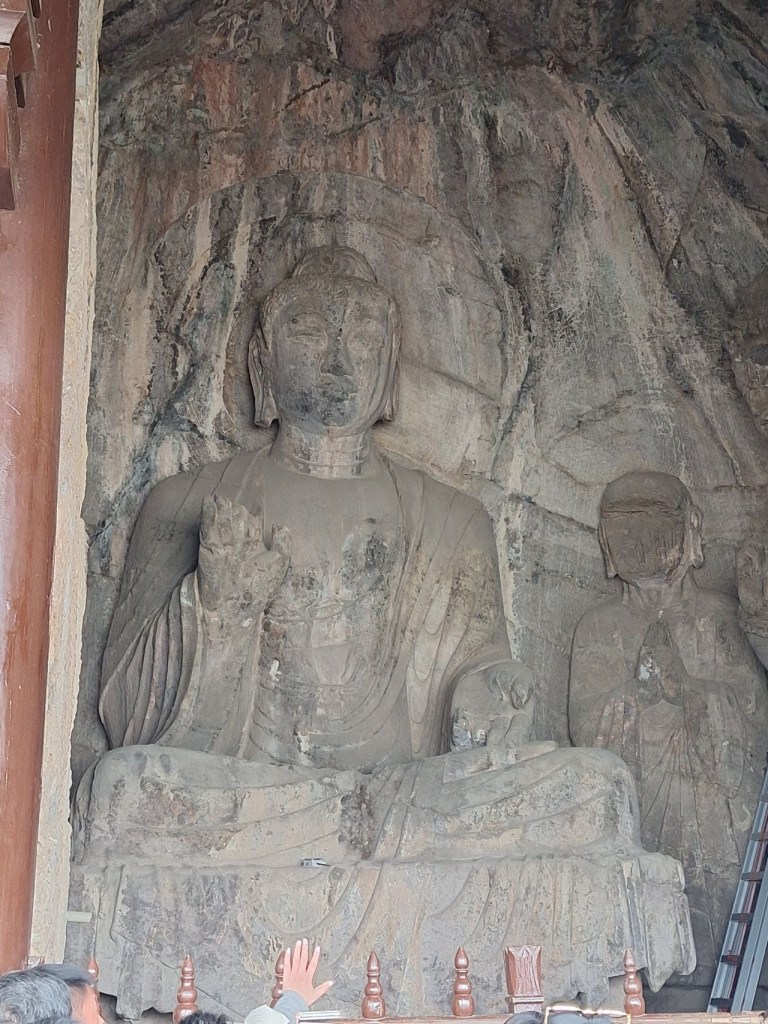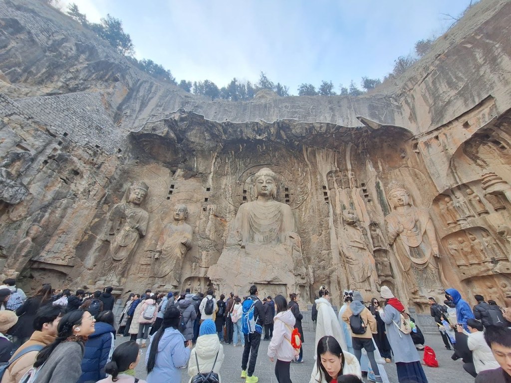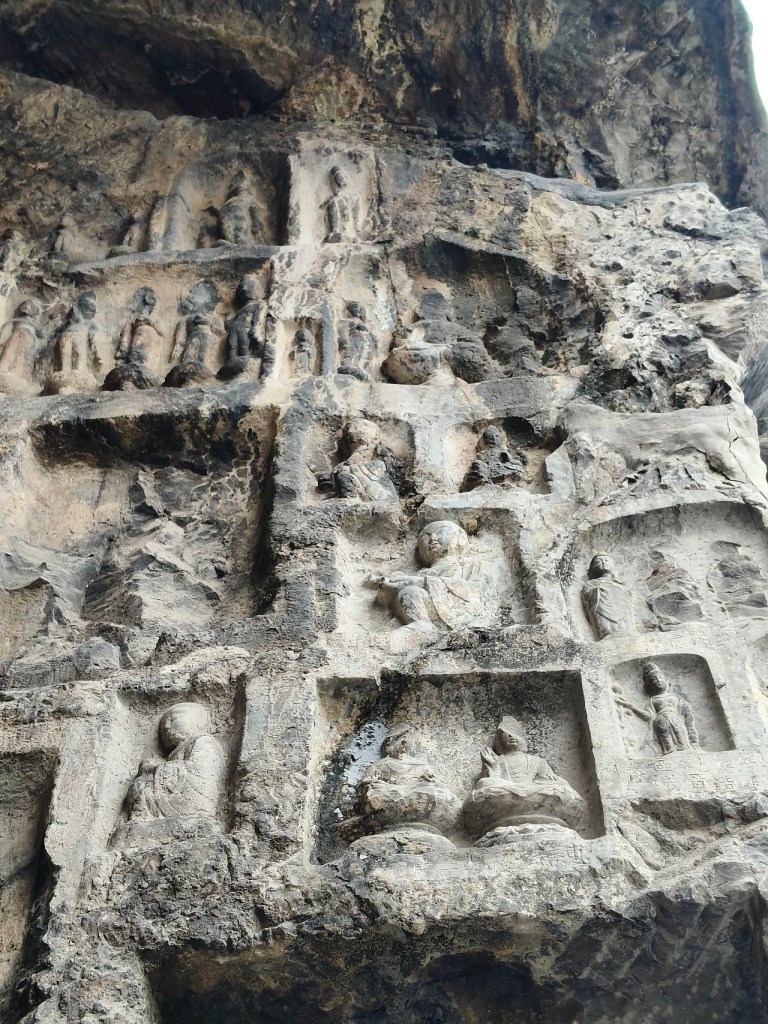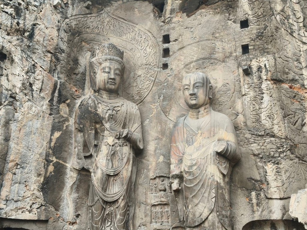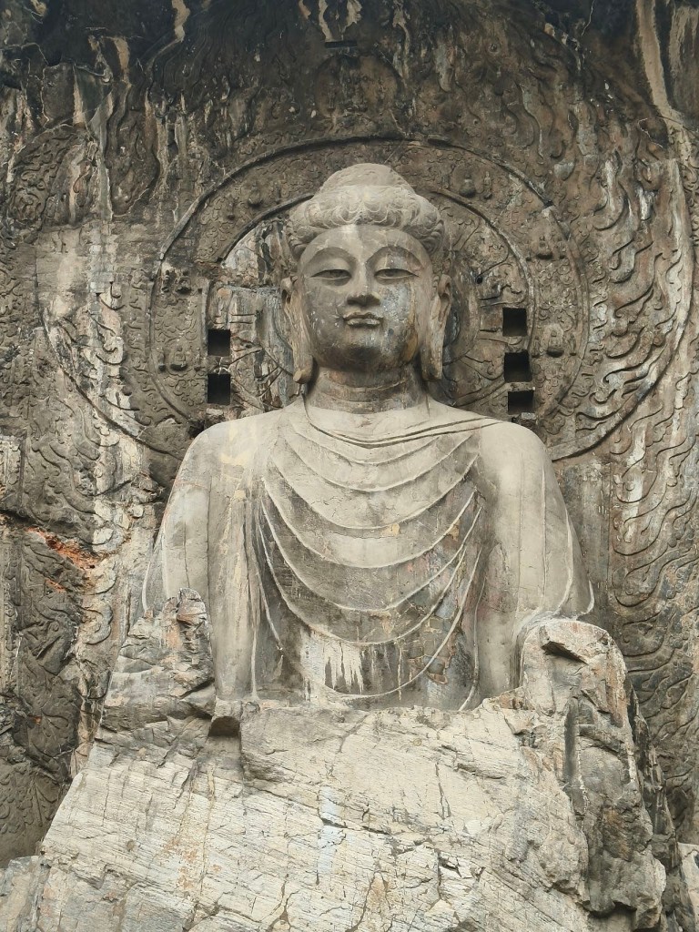 ที่นี่เราจะได้พบกับความยิ่งใหญ่อลังของงานแกะสลักหน้าผาขนาบแม่น้ำอี๋ (Yi River) อายุกว่า 1,500 ปี จนได้รับยกย่องจาก UNESCO ให้เป็นมรดกโลก เช่น พระโพธิสัตว์ไวโรจนะ (Vairocana Buddha) องค์ใหญ่ยักษ์สูงกว่า 17 เมตร ใบหน้าอิ่มเอิบ สง่างามมาก ขนาบข้างด้วยรูปปั้นพระสาวกและทวารบาลที่แกะสลักได้ดูมีกล้ามเนื้อและอารมณ์ที่สมจริงสุดๆ