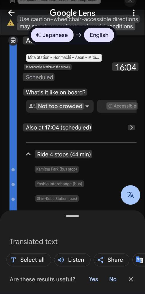 ส่งไปแปลใน Google Lens โดยเลือกแปลเป็นภาษาอังกฤษ ก็จะพอทราบข้อมูลป้ายหยุดรถแต่ละจุด … แต่จุดเด่นที่โดนใจของ Google map ก็คือแสดงการเดินรถเรียลไทม์