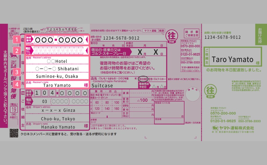 หรือกรณีจากโรงแรม ก็สอบถามพนักงานโรงแรม ว่าโรงแรมมีบริการแมวดำ Yamato ไหม (คุยไม่รู้เรื่อง ก็โชว์ภาพสัญลักษณ์ขนส่งแมวดำ) หากโรงแรมมีบริการ พนักงานจะเอาแบบฟอร์มมาให้เรา เราก็ใส่รายละเอียด จากนั้นยื่นแบบฟอร์มพร้อมกระเป๋าเดินทาง ให้พนักงาน รับเอกสารยืนยันเก็บรักษาให้ดี ส่วนมากจะไม่มีการจ่ายเงินที่ต้นทาง โดยจะไปจ่ายปลายทาง